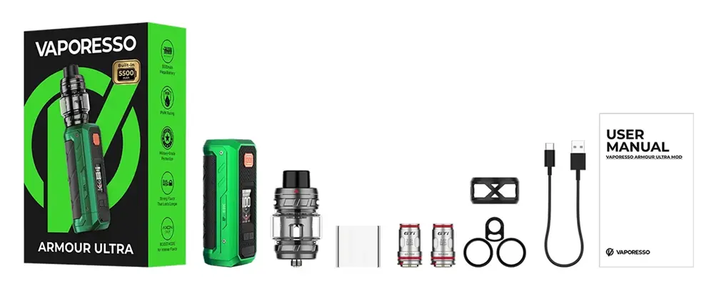 The Vaporesso Armour Ultra Vape Kit stands out because of its massive 5500mAh built-in battery and adjustable 5–100W power range. This means all-day vaping without constant charging and full wattage control for different vaping styles.